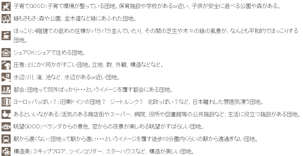 「緑もさもさ」「眺望GOOD」「構造美」といった12のアイコンで団地を表現。まるで本を読むように、あるいは旅の計画を立てるように団地を選ぶ楽しさが味わえるのです。