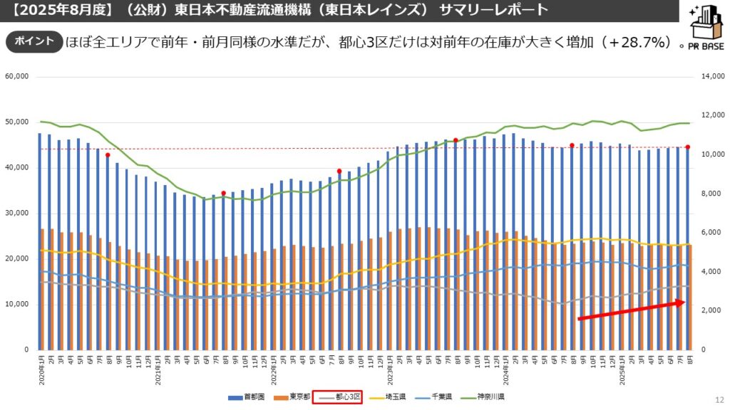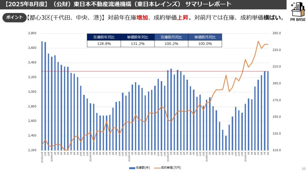 都心3区(千代田区、中央区、港区)は在庫が対前月でかなり増加しました(前年比+28.8%)。2025年に入ってからは特にこの傾向が目立ちます。