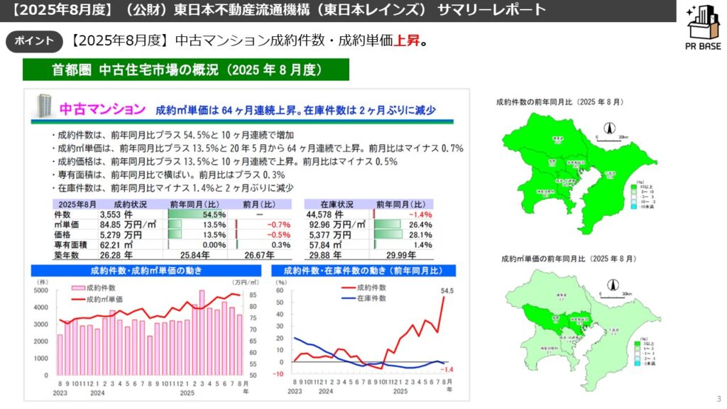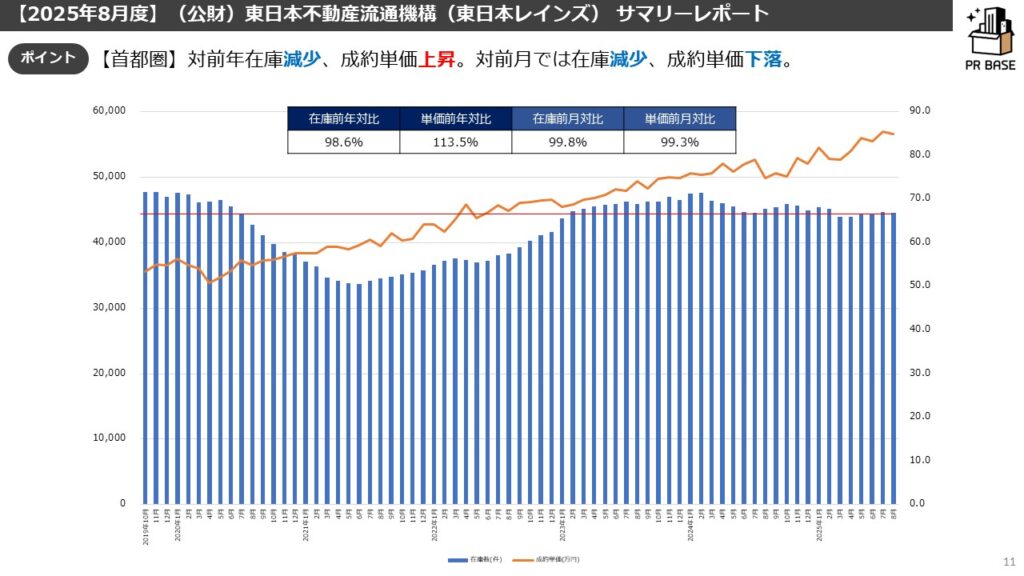成約㎡単価は64ヶ月連続で対前年同月でプラス(前年比+13.5%)、在庫件数は2ヶ月ぶりに減少した(前年比−1.4%)。