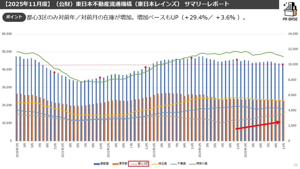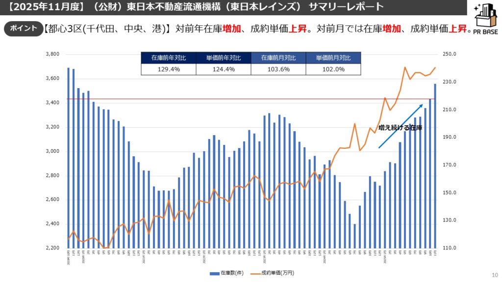 都心3区(千代田区、中央区、港区)は対前月在庫がまた増加しました(前年比+2.2%)。2025年に入ってからは特にこの傾向が目立ちます。