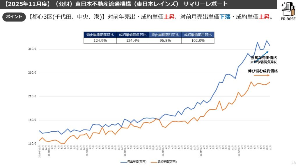 毎月同様のことを申し上げていますが、都心エリアの成約単価が引っ張る形で中長期的には上昇です。