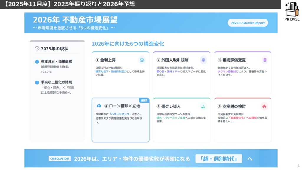 2025年も残すところあとわずかとなりました。画像は、現在の市場データと政策の動きをもとに、2026年の不動産市場がどう動くかをまとめたものです。