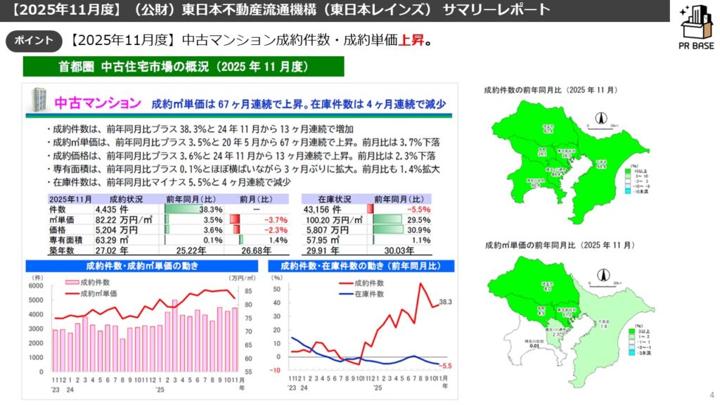 成約㎡単価は67ヶ月連続で対前年同月でプラス(前年比+3.5%)、在庫件数は4ヶ月連続減少した(前年比−5.5%)。