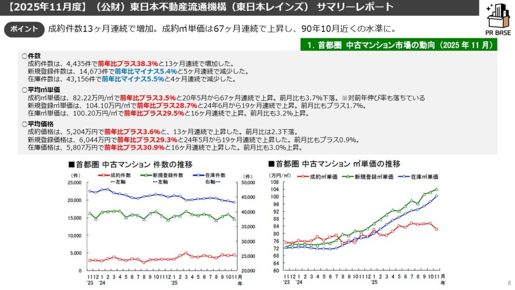 成約件数は13ヶ月連続で増加、成約㎡単価は67ヶ月連続で上昇、1990年10月以来の水準になっています。