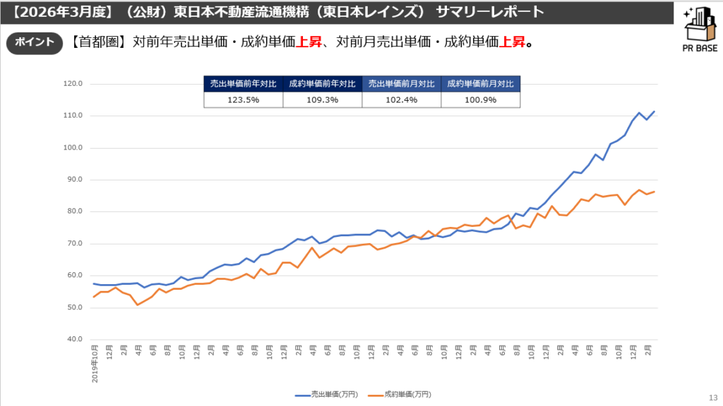 毎月同様のことを申し上げていますが、都心エリアの成約単価が引っ張る形で中長期的には上昇です。
