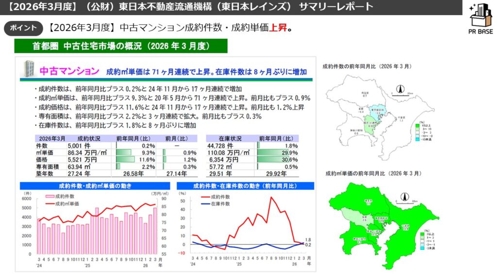 1都3県全体では、対前年成約数増加↑・成約単価上昇↑/対前月在庫減↓・成約単価上昇↑