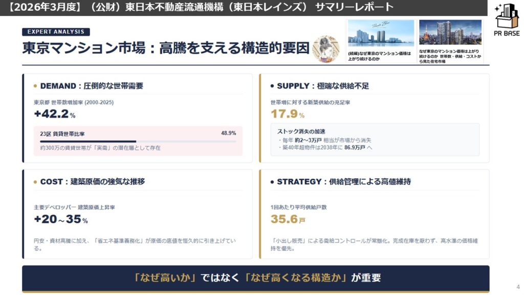 そして、都心3区から城東エリアへ需要が波及しています! 「なぜ高いか」ではなく「高くなりやすい構造」を理解することが重要ですね。