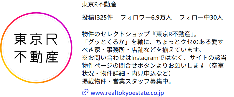 ということで、見せ方のパイオニア的な存在の東京R不動産さんのInstagramアカウントをご紹介していきます。